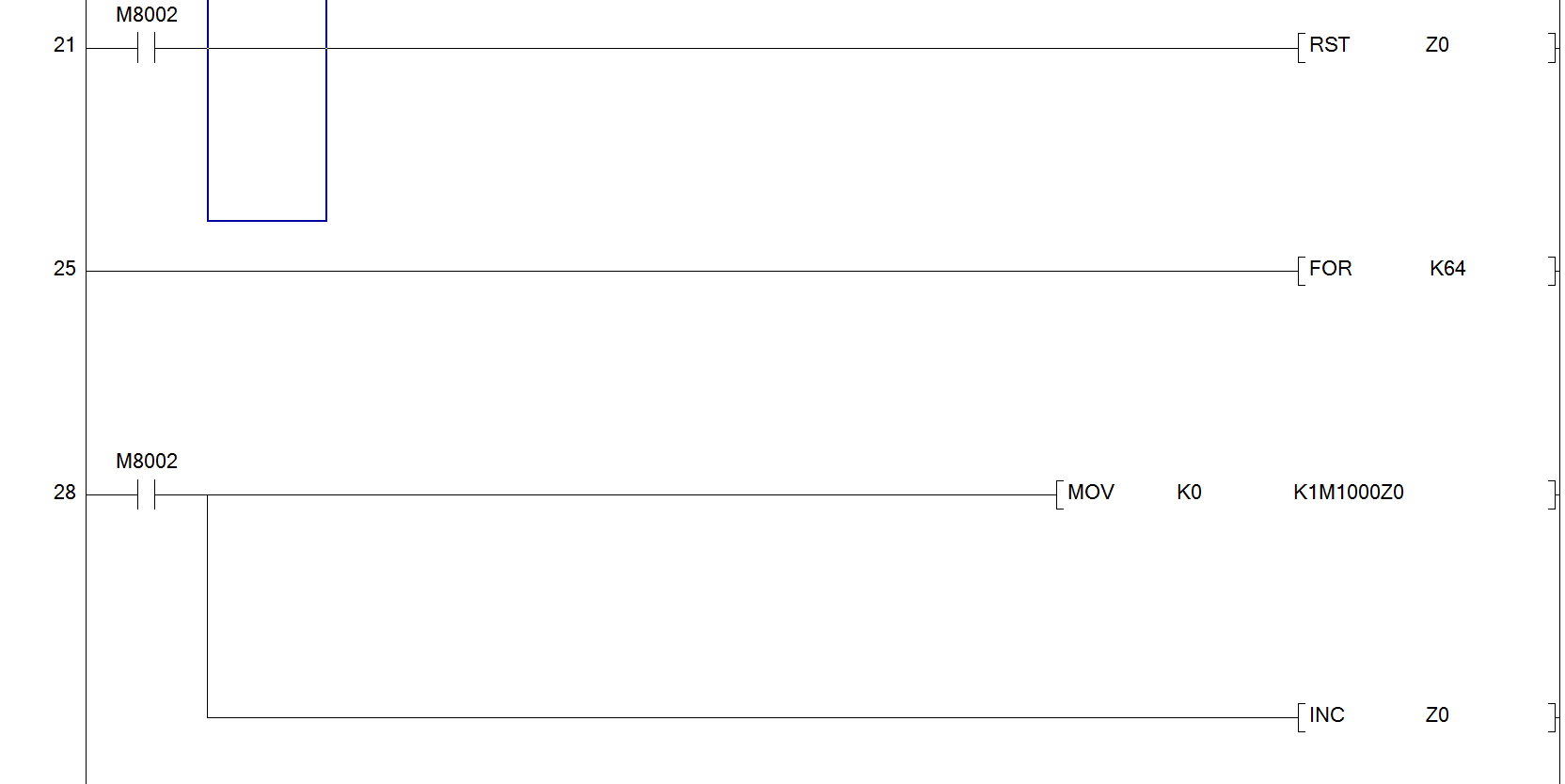 然后FOR循環64次,每次循環就會把K0給到 K1M1000Z0(Z0時一個變址)的M1000~~M10004  4個BIT的位的狀態復位及至零,