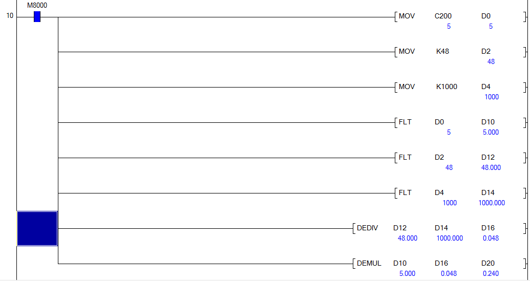 引用引用樓主劉偉哥于2020-03-29 19:38發(fā)表的 求助FX2N帶小數(shù)點(diǎn)的乘除法運(yùn)算 :計(jì)數(shù)器C200的值乘以0.096(來(lái)自文本編輯器)再除以2,再通過(guò)文本編輯器顯示。哪位能幫忙解決一下。感激不盡!