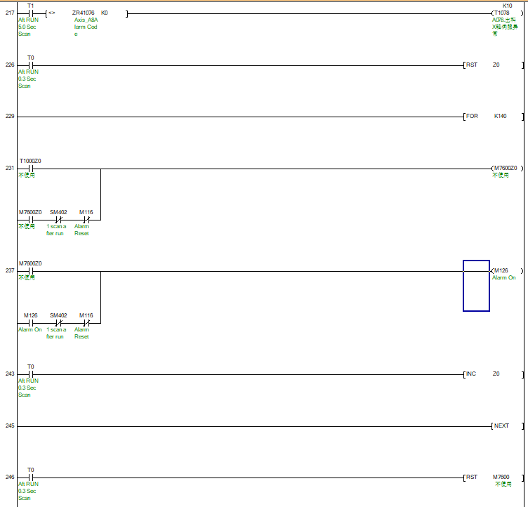 看過韓國日本的寫法。對于幾百上千的報警,用K8M0Z0來掃描報警,輸出一個M2000。就算是有1024個報警,z0以32的倍數來變化。即使有報警也會在很短的時間內捕捉到。有報警時,機器已經停止,但是報警也會很快發出來。新的報警來了,蜂鳴器想起。這個很容易辦到。