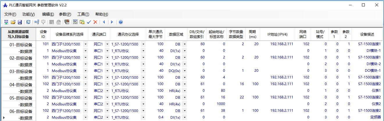 網關與PLC之間是網絡通訊,采用PLC廠家的專用協議,無需PLC編程配合。案例是采用的西門子S7-1500系列的PLC,下位設備分別是遠程模塊、儀表和變頻器,完整的數據配置表如下圖: