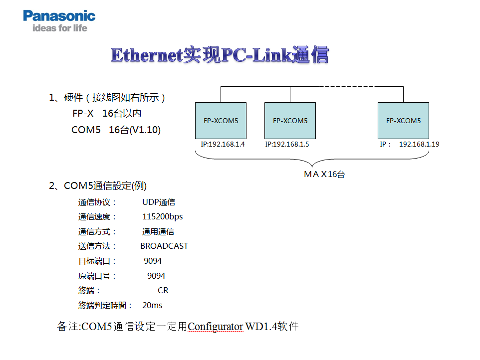 請問各位大師,兩臺松下FP-XH/PLC+COM5網絡模塊如何實現Ethernet  PC-Link通信呢,具體要如何設定呢?現在只能用網口下載和監控程序