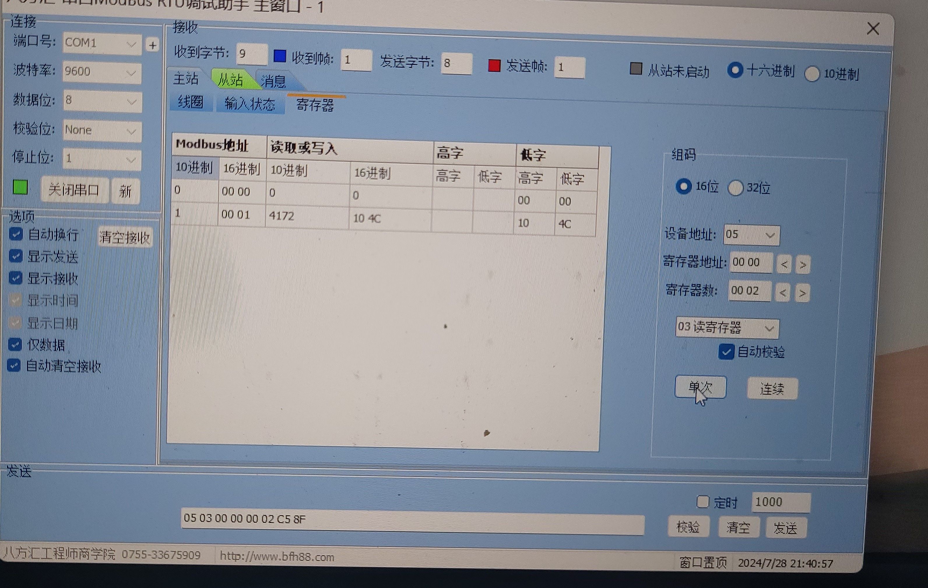 你按8位格式發送。建議使用modrw指令,COM3端口通訊,讀取數據方便。