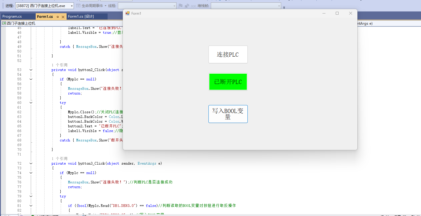 label1.Text = "已連接到PLC";//改變label1文字為已連接到PLC