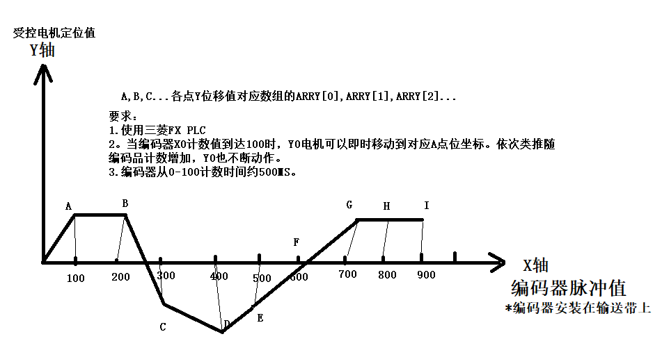 詳細要求如下圖:1.使用三菱FX PLC2.當編碼器X0計數值到達100時,Y0電機可以即時移動到對應A點位坐標。依次類推隨編碼品計數增加,Y0也不斷動作。3.編碼器從0-100計數時間約500MS。