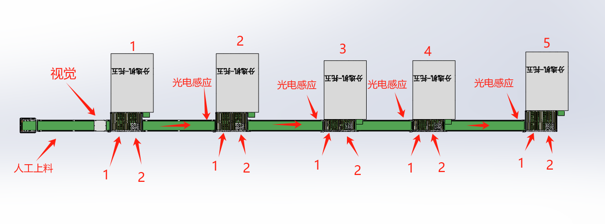 人工上料之后,立馬對接視覺,然后分成兩個去向,A產品和B產品,都有幾個緩存位,然后在設備1前端匯合,需要A或者B再去自動調撥產品,這樣也能隨時根據現場的情況補A或者B的產品