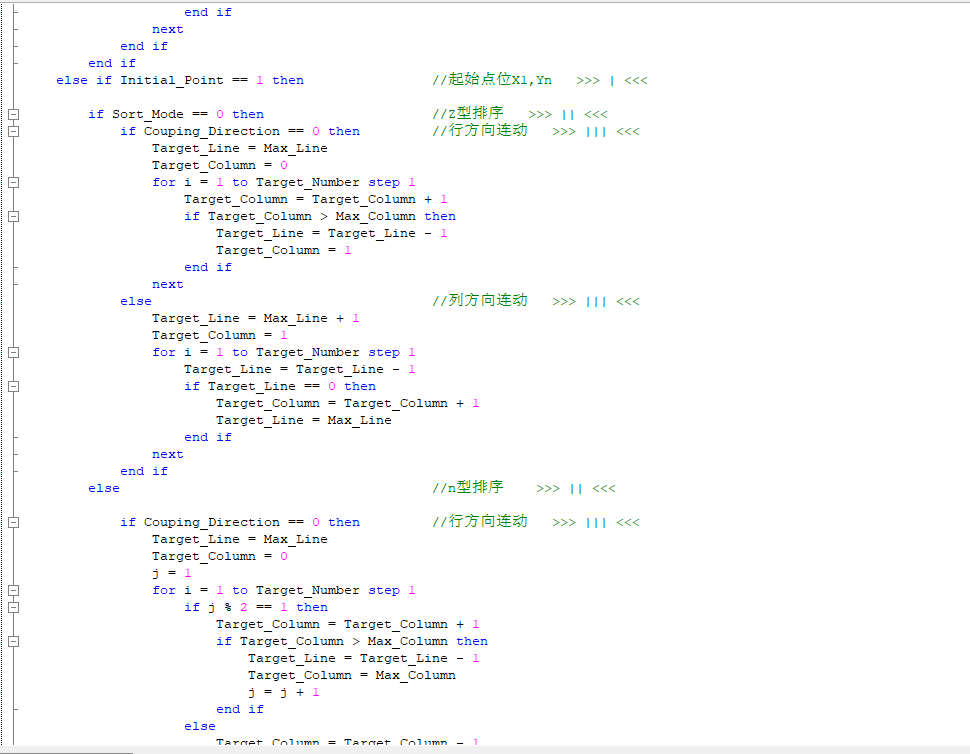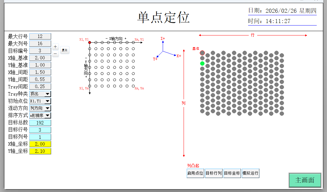 原理是用for循環實時計算行列編號,通過編號計算對應點的坐標和實現預覽效果,好處是集合了Z型n型連動選擇,起始點選擇。因為是實時刷新的,意味著停止任務,更改目標點編號或者連動方式會按新的模式繼續計算。其他也沒什么具體功能,最初是打算補上三點定位法的集成到一起的,但是后面這部分做到PLC里了,就沒更新這個了。具體效果離線模擬一下就知道了。