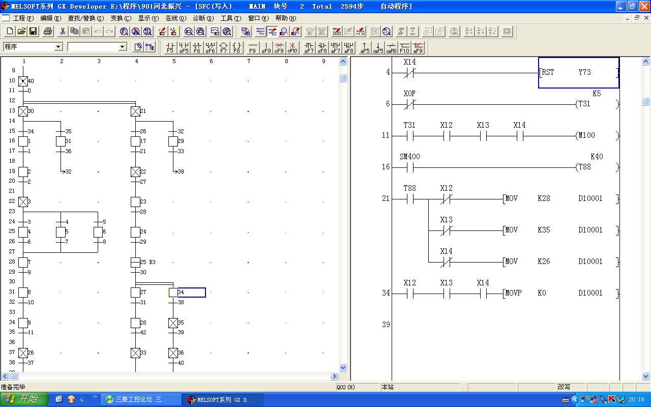 我碰到個奇怪的問題,求教各位大俠。我用的三菱Q02CPU,SFC編程,在程序的某一塊的某一步里(見圖)M100前面的條件全通了,M100沒輸出,我搜索了一下整個程序沒有M100的雙線圈,也沒有復位M100的語句,不知還有什么原因導致M100不通,謝謝。