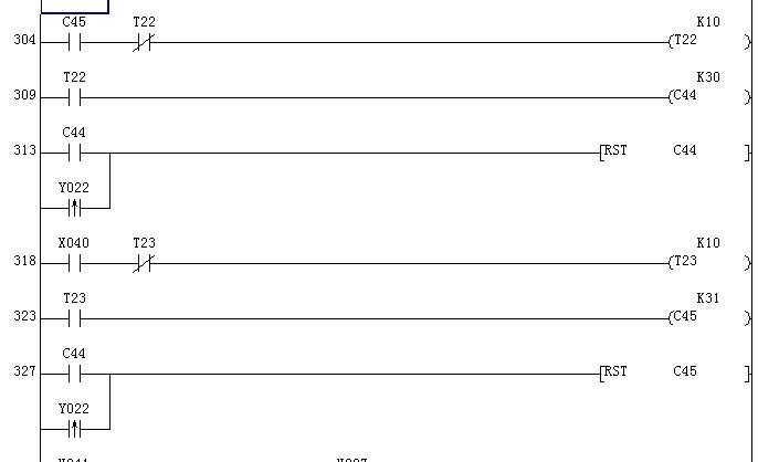 因為程序是自上而下掃描的,當程序掃描到327步的時候,C44已經復位(已經OFF),所以C45不能復位