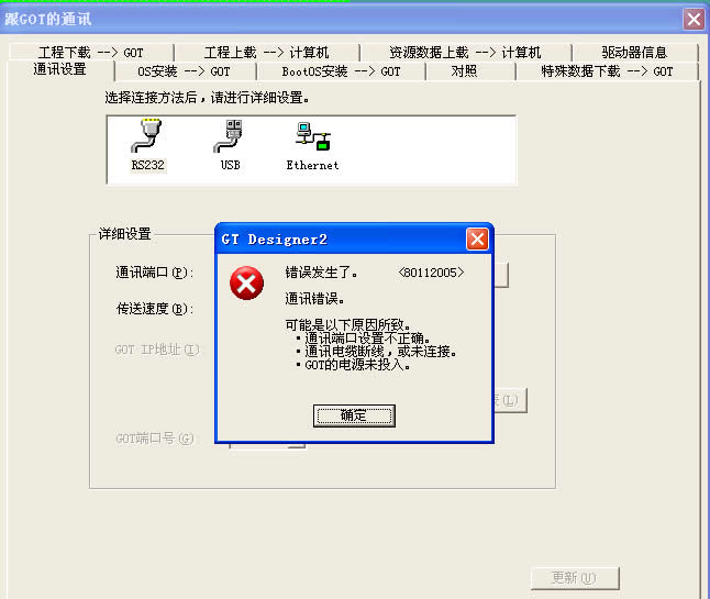 三菱GT1055-QSBD-C在灌程序時老是提示:80112005 通訊錯誤。 是不是屏幕版本問題啊??