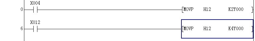 MOVP   H12   K2Y000是將十六進制12傳送給Y000——Y007(八位),MOVP   H12    K4Y000是將十六進制12傳送給Y000——Y017(十六位)