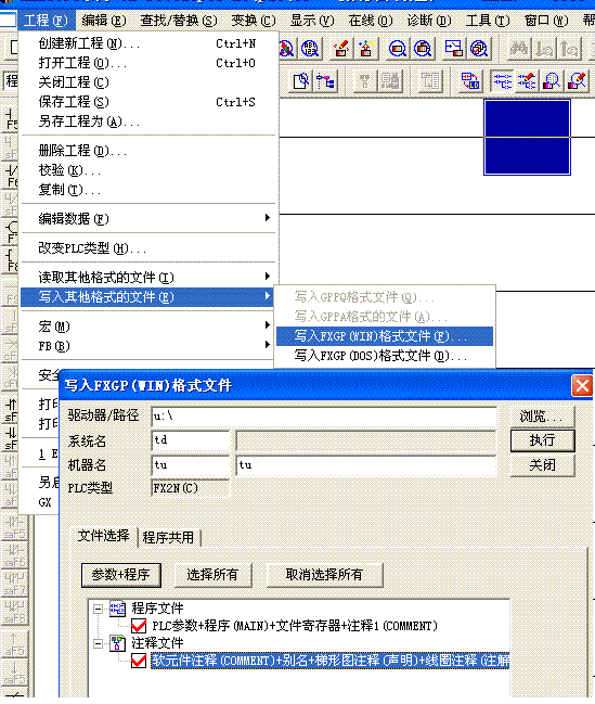 打開要轉換的程序,在gx developer程序,在"工程"------"寫入其它格式文件"-------"寫入FXGP(WIN)文件",彈窗,做好設置,執(zhí)行OK。