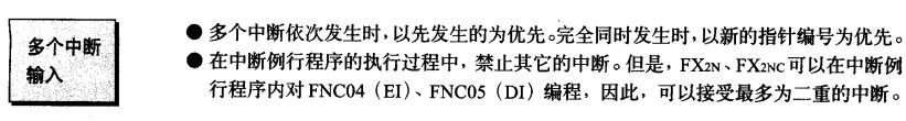 PLC按先來(lái)先服務(wù)的原則處理中斷。任何時(shí)間點(diǎn)上,只有一個(gè)用戶(hù)中斷程序正在執(zhí)行。一旦中斷程序開(kāi)始執(zhí)行,它要一直執(zhí)行到結(jié)束。而且不會(huì)被別的中斷程序,甚至是更高優(yōu)先級(jí)的中斷程序所打斷。當(dāng)另一個(gè)中斷正在處理中,新出現(xiàn)的中斷需要排隊(duì),等待處理。 -----摘自《S7-200可編程控制器系統(tǒng)手冊(cè)》 圖片來(lái)自《三菱FX系列PLC編程手冊(cè)》 [ 此帖被sjm213在2010-10-09 13:38重新編輯 ] |