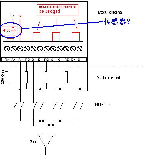 例如對于二線制傳感器,我要接線的話,就是將+24V的直流電接道傳感器的正(+)上,再將負(-)接回模擬量模塊的A+上,A+與RA短接,A-接直流電的0V,這樣就可以讀出數值來了?
