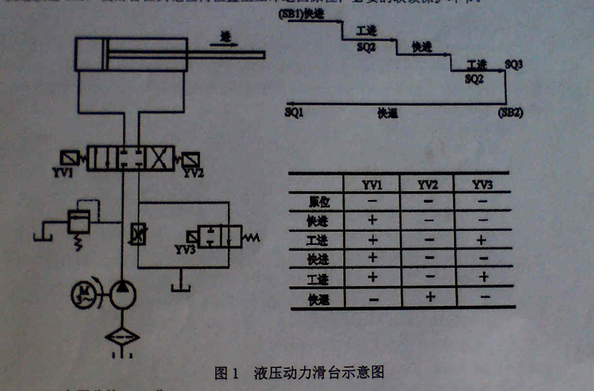 該液壓動力滑臺的工作循環、油路系統和電磁閥通斷表如下圖所示。SQ1為原位行程開關,SQ2為工進行程開關,在整個工進過程中SQ2一直受壓,故采用長擋鐵,SQ3為加工終點行程開關。本題假設液壓泵電動機已啟動。