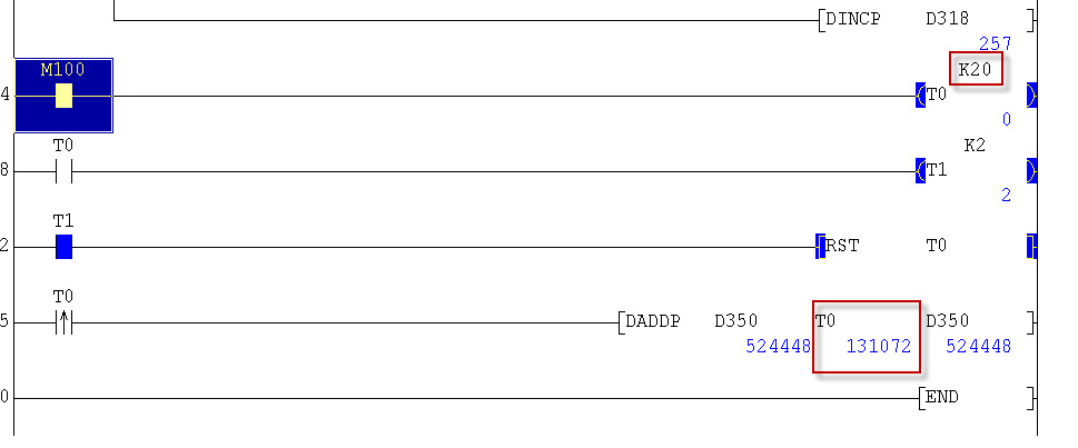 4,將T0上升沿后做加法運算這一句緊放在T0輸出線圈這一句后面可以避免這種情況;T0輸出線圈這一句放在RST T0這段后面更好。