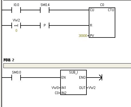 如果以分鐘來做倒計時的話可以用SM0.4來觸發一個計數器C0  .假如設定VW0=30分鐘的倒時計就用VW0-C0=VW2  這樣VW2的值就是30 29  28  27  26   。。。。0