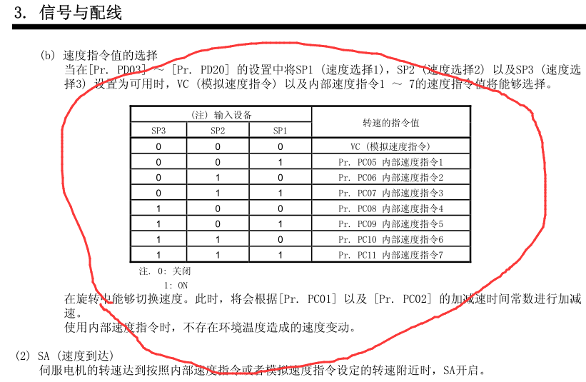 如表,我要的轉速指令值是VC,PD03注釋的卻是15腳的定義,SP1、SP2、SP3何來?速度控制模式下