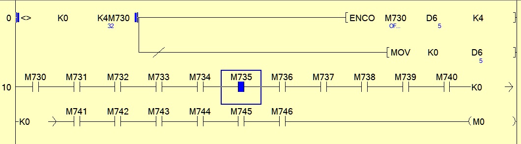 這個命令的要點就是十進制轉換成二進制,你等于9的時候就是1001,應該是M730和M733一起ON了,不知道你所說的連續性是什么意思