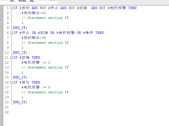 IF Start_1 AND NOT Stop_1 AND NOT Fault_1 THEN  //電機啟動條件