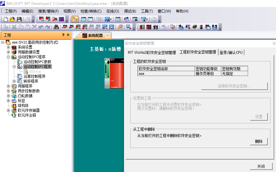 如下圖,SFC已加密。   MT軟件安全密鑰(Security Key)也加密,并設成 了操作員權限,從而使得其它沒有安裝本密鑰文件aaa的電腦無法打開本工程文件,更無法從Q173DSCPU上載本程序。