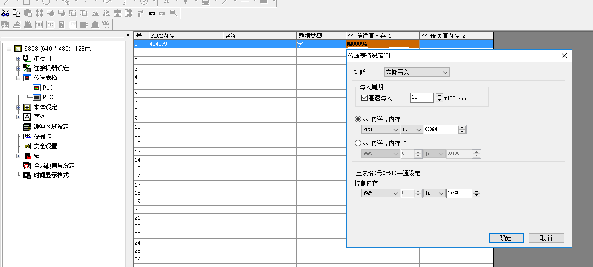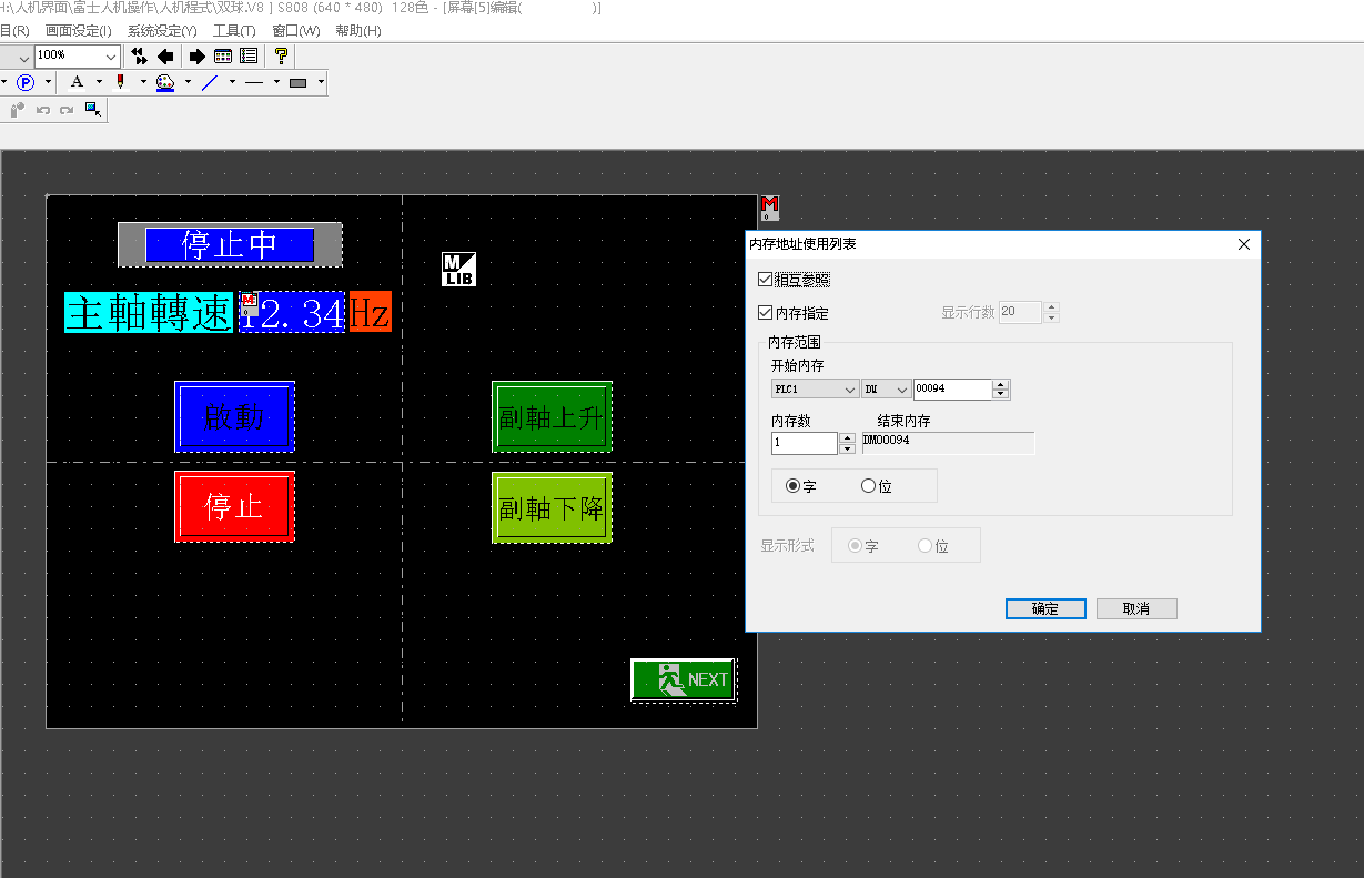 富士的觸摸屏S808 歐姆龍CP1E-N20的PLC 士林的變頻器 硬件連接:觸摸屏COM1連接變頻器(RS485) 觸摸屏COM2連接PLC 只需在主軸轉速后寫入HZ數 按下啟動 就可運行至設定HZ 我看了下觸摸屏與PLC程序 只要將HZ數MOV到D94 就完成了 但是我在觸摸屏上找不到D94的設置 在PLC上也就是將HZ數MOV到D94 達到運轉HZ數效果 請問這是如何完成的 有朋友知道嗎? 本人剛學不久 還有有知道的朋友告之 |