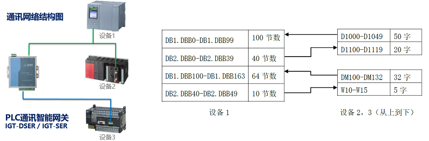 通訊端口參數設置完成、確定網關與PLC設備通訊正常后,再配置PLC通訊的寄存器地址,按照上述任務配置好的數據表如下圖: