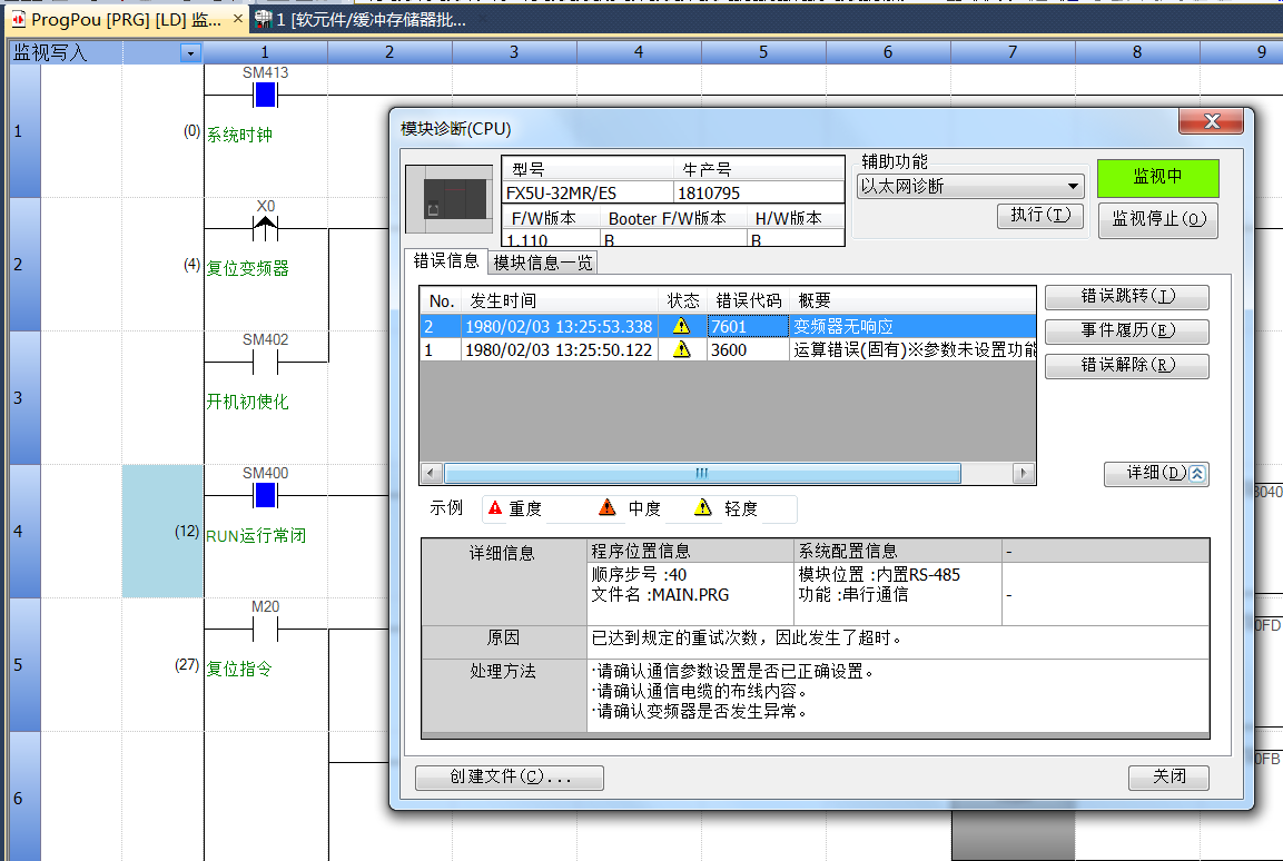 請問各位大師 ,我用FX5U的PLC和FR-E740變頻器485通訊,為什么設定參數之后始終通訊上不呢,PLC的SD燈為閃而RD燈沒有反應,PLC報通訊錯誤,麻煩各位大師出來給指導一下,在此謝過各位大師了!