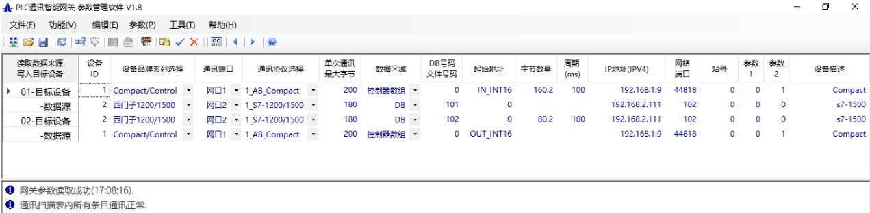 上表中設備ID是每臺PLC設備的號碼,可在1~254之間自由分配;DB號碼/文件號碼參數里AB的PLC對應數組內的起始地址,支持多維數組,比如二維數據格式為0,0;起始地址參數里AB的PLC對應數組名稱,或者變量名稱,須要與PLC內的名稱完全一致;字節數量設置交互的字節數據,只需設置目標設備的數量,上圖中的160,2表示160個字節,PLC內存為2字節數據,如果PLC的數組數據類型是DINT,則設置為160,4;網絡端口參數AB的是44818,S7的是102;更詳細的參數介紹查看網關的手冊第6章(用戶手冊下載地址)。