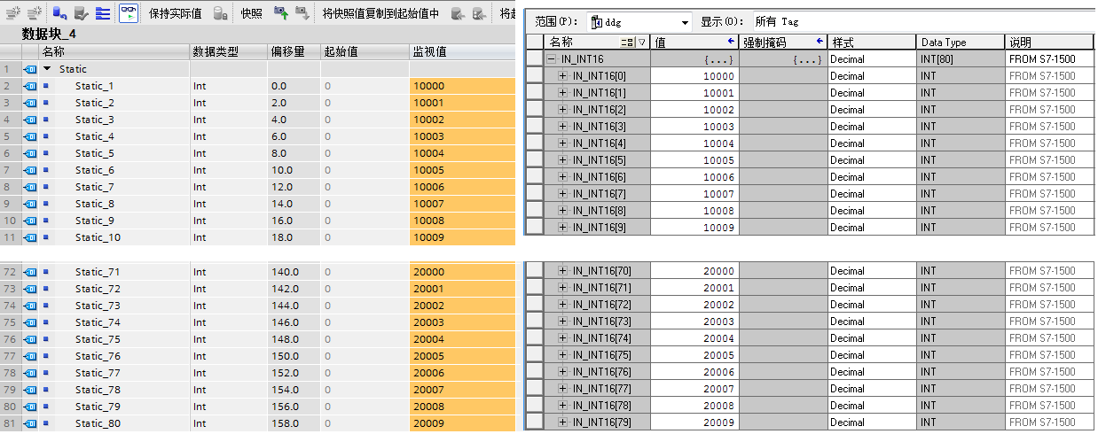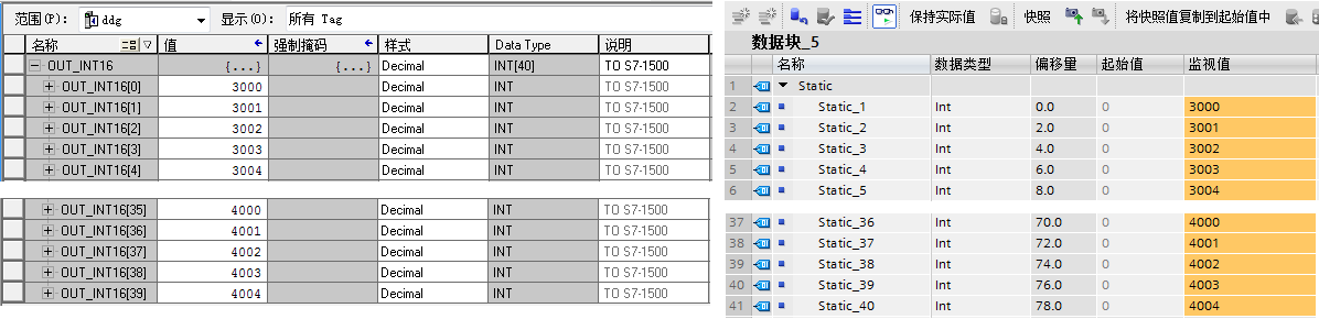 可以看到數值都能對應上,然后同樣的方法測試從AB的PLC到S7的數據,在OUT_INT16數組的前5個和最后5個設置上數據,然后通過博圖軟件監視,如下圖: