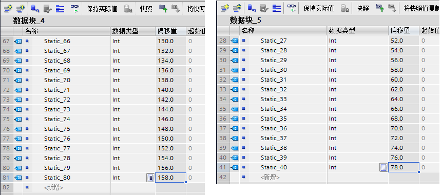 然后在西門子PLC內建立數據塊_4和數據塊_5兩個DB,號碼分別是DB101、DB102,DB101寫入到AB的PLC,DB102接收AB的PLC數據,都需要取消優化訪問,字節數據與AB的PLC對應,如下圖,同樣新建立的DB須要下載后重啟PLC才會生效。