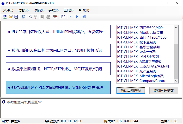然后開始配置網關,通過網關的參數設置軟件(下載地址)搜索到網關模塊后,讀取默認參數,在'功能'->‘類型與設備選擇’頁面的4種類型選擇最下面一項,點'確認當前選擇'按鈕,切換為類型4,系統為IGT-CLI-MEX,即多設備數據交互模式,如下圖,然后下載重啟: