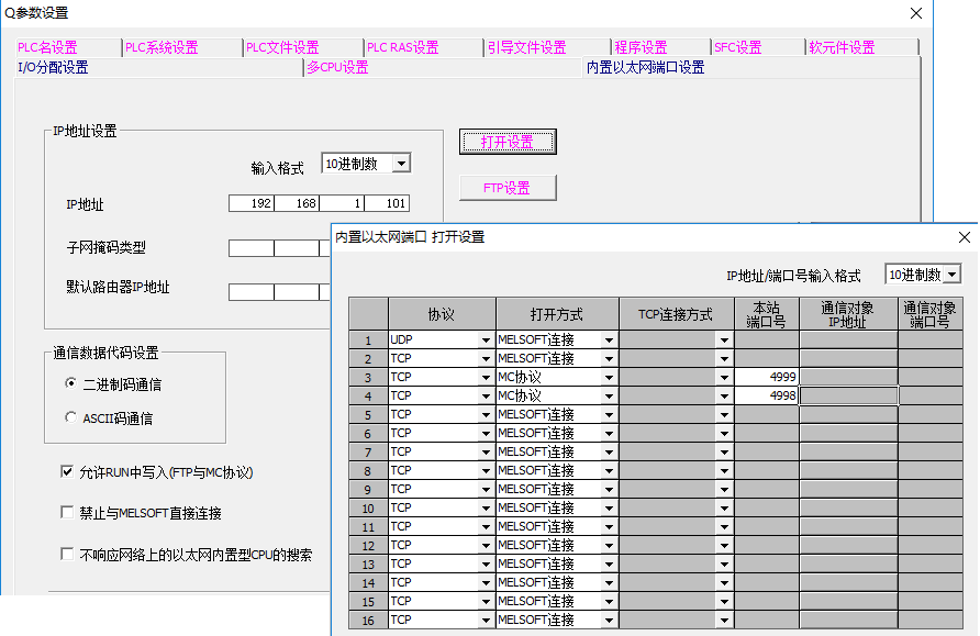首先設(shè)置三菱PLC的IP地址、通訊端口和通訊協(xié)議,如下圖: