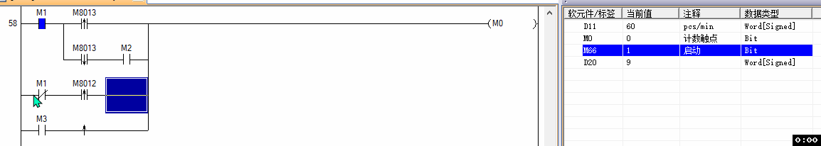 原理是記數接近開關的一個脈沖給一個M型中繼自鎖,同時時間繼電器得電記時,