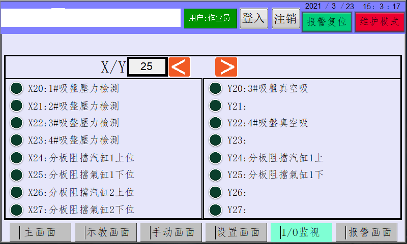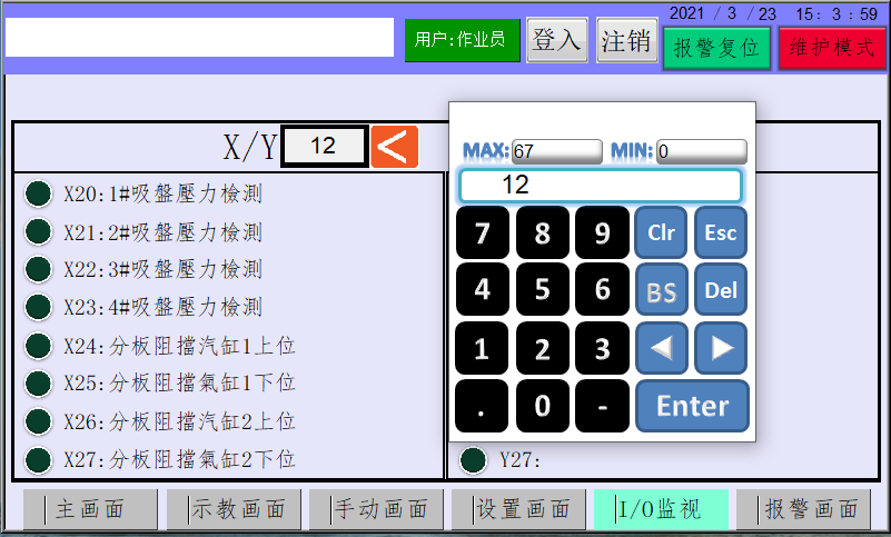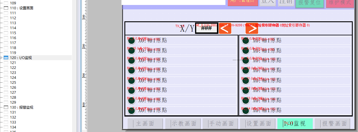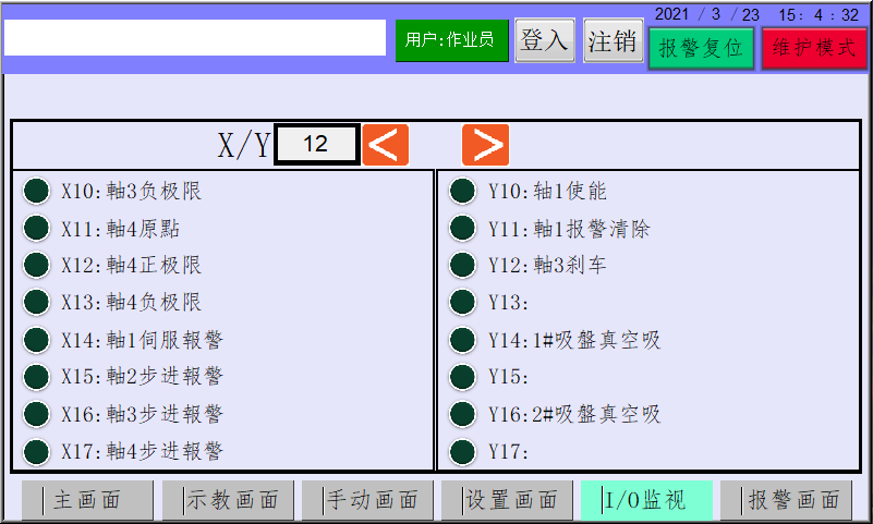 維倫HMI一個界面實現多I/O查看支持搜索功能,例如想找X12就再數據輸入控件中輸入12即可找到X12,Y12相關內容,很方便。