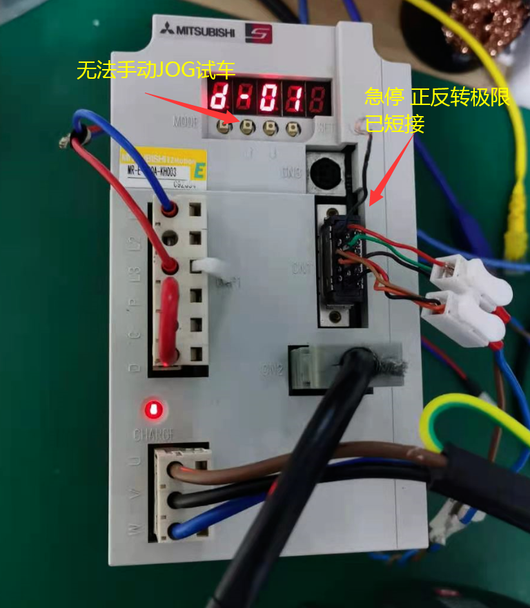 網上找了JOG試車教程,按驅動器上的“MODE”鍵選擇到診斷畫面:“rd-oF”,按UP鍵三次切換到“TEST1”,按SET鍵2秒進入“d-01”,按UP和DOWN可以使電機正反轉,點動運行,即JOG,但是為什么到d-01界面,按UP和DOWN,電機不轉呢?CN1的急停,正反轉極限都接好了,而且上電沒有報警。但是就是不能手動JOG試車,這是怎么回事?需要出廠設置嗎?這個MR-E的伺服怎么恢復出廠設置,我網上看到的資料是①將19改為ABCD,斷電再上電②將182改為0112,斷電再上電。。但是沒有找到182參數,這個伺服JOG運行應該不受限制吧,為什么不能轉?謝謝師傅們百忙之中,為小弟解答一下,謝謝