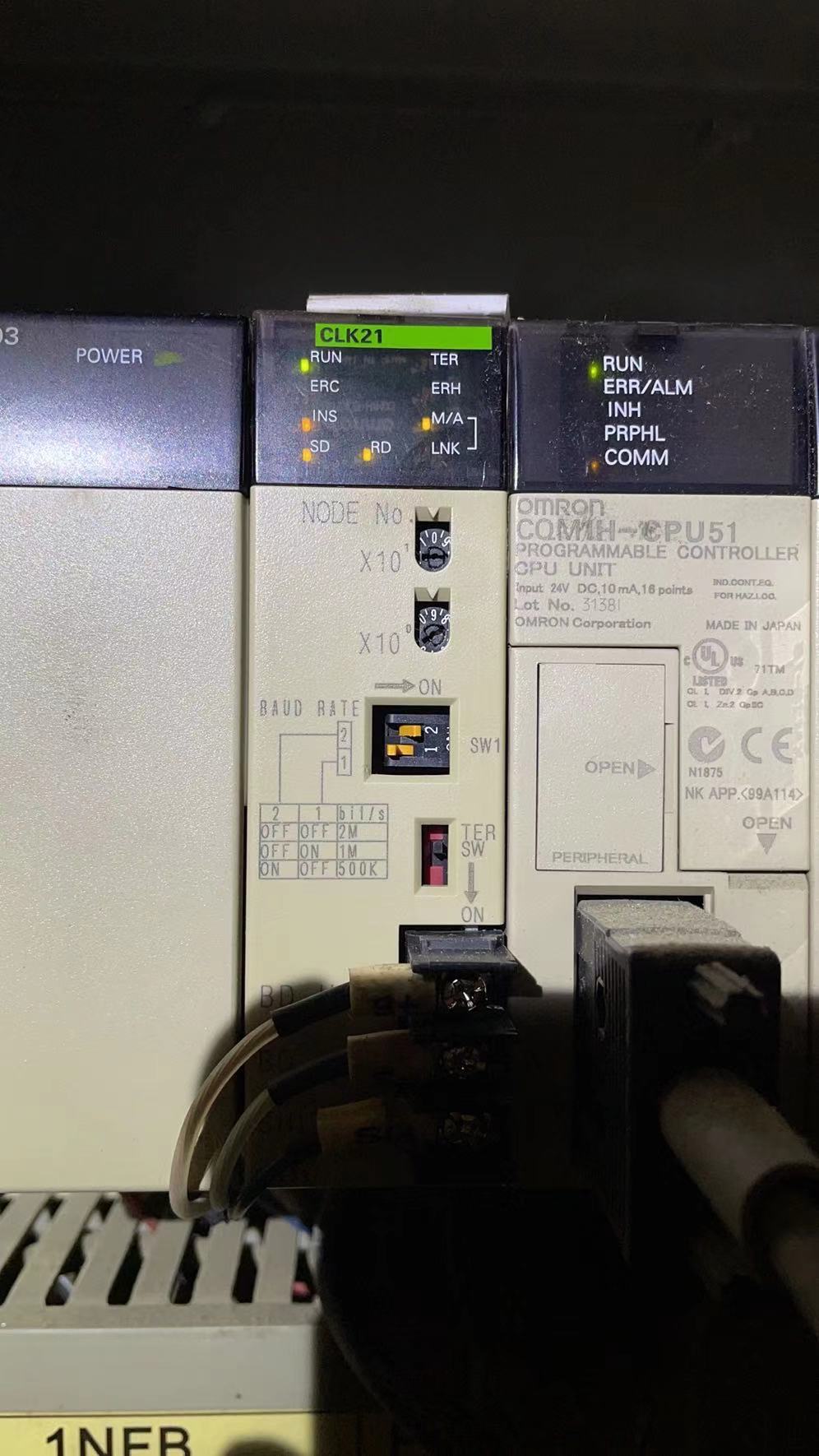 我司機器上現用老款CQM1H-CPU51的PLC,現在因為通訊模塊CLK21壞了,從淘寶購買一塊CLK21回來把站號、拔動開關都按原模塊設好,安裝上去后無法通訊,RUN、INS、M/A、SD、RD燈亮,LNK燈不亮;請大家幫忙指點一下,謝謝!