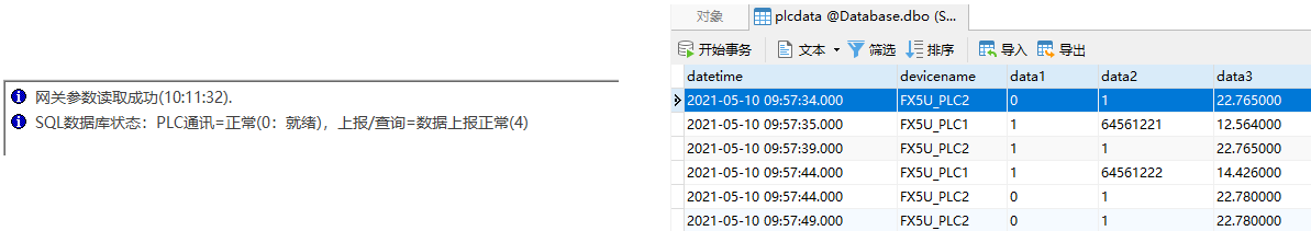 參數編輯完成后通過‘參數’->‘參數寫入到網關’將參數下載,然后通過‘工具’->‘重啟網關’重啟,再通過‘參數’->‘從網關讀取參數’查看網關的工作狀態,沒有出現紅色圖標的報警消息就是正常的, 通過數據庫工具軟件Navicat連接數據庫,查看網關上報到plcdata表的數據: