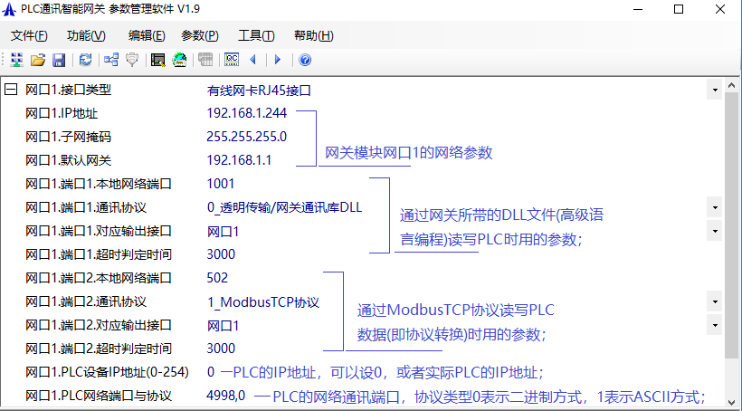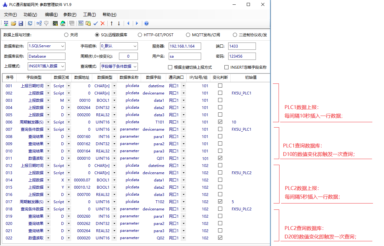 以下是兩臺FX5U與數據庫雙向通訊的案例,首先設置網關的IP,PLC的端口和協議等參數,如下圖: