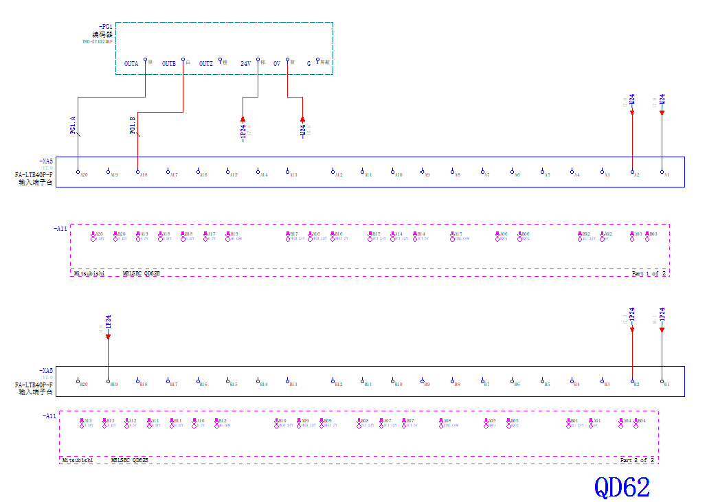 QD62連接編碼器高速計(jì)數(shù),測(cè)試OK。 40針模塊接線:A20接編碼器A相,A18接編碼器B相,A1、A2接0V,B1、B2、B19接24V。 |