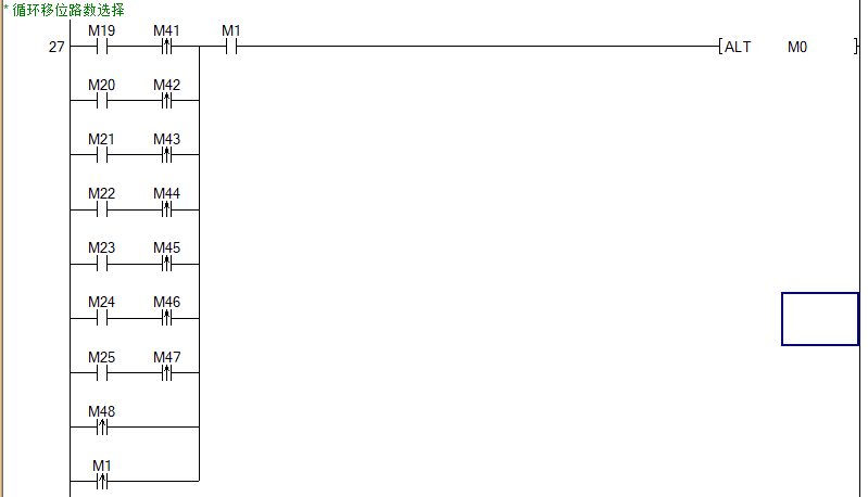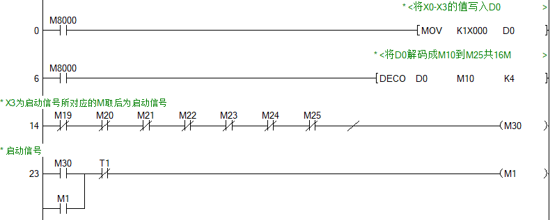 DECO對應把X0-X3 組合傳到D0解碼成M10到M25共16個M,,其中對應起作用的是M19到M25共7個M,一方面是組成啟動信號,另一方面是作為循環移位路數的選擇開關。