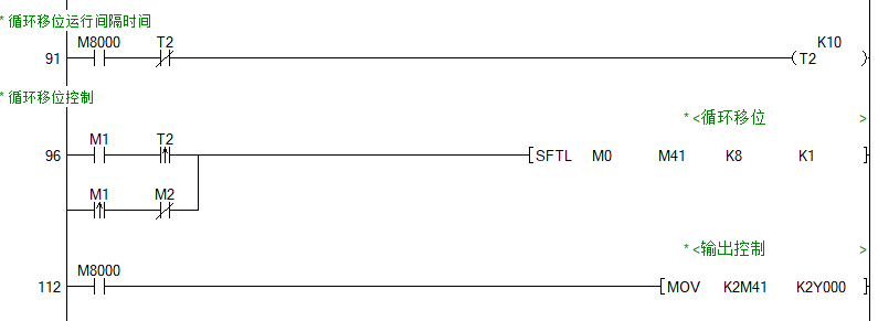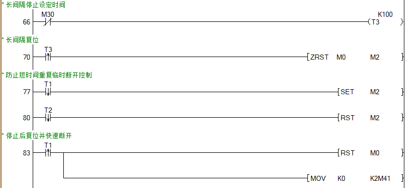 我廠有一碼頭吊機, 160專變供電,因碼頭吊機工作特性,動作一次從抓料、提升、轉位、放料、回位前后二十多秒,普通電容補償投切速度跟不止,所以想了一個方案如下:用一個電流繼電器檢測負載電流,當電流大于設定值,觸點閉合,接通X4,后,由內部程序轉換為啟動信號,按設定延時時間后間隔控制多路Y循環移位輸出,實際輸出路數可用X0-X3組成合1248編碼成1路到7路任意路循環移位輸出,如預先短接X0和X2,按編碼組合是5,程序把5解碼后給對應的程序將SFTL循環移位指令進行控制,讓其產生5路輸出、3路不輸出且往右移位,此目的是讓電容組至少有一組在停歇,不至于長時期工工。當短時間沒啟動信號程序不會馬上停止輸出,當沒信號時間大于一定時后才停止輸出。