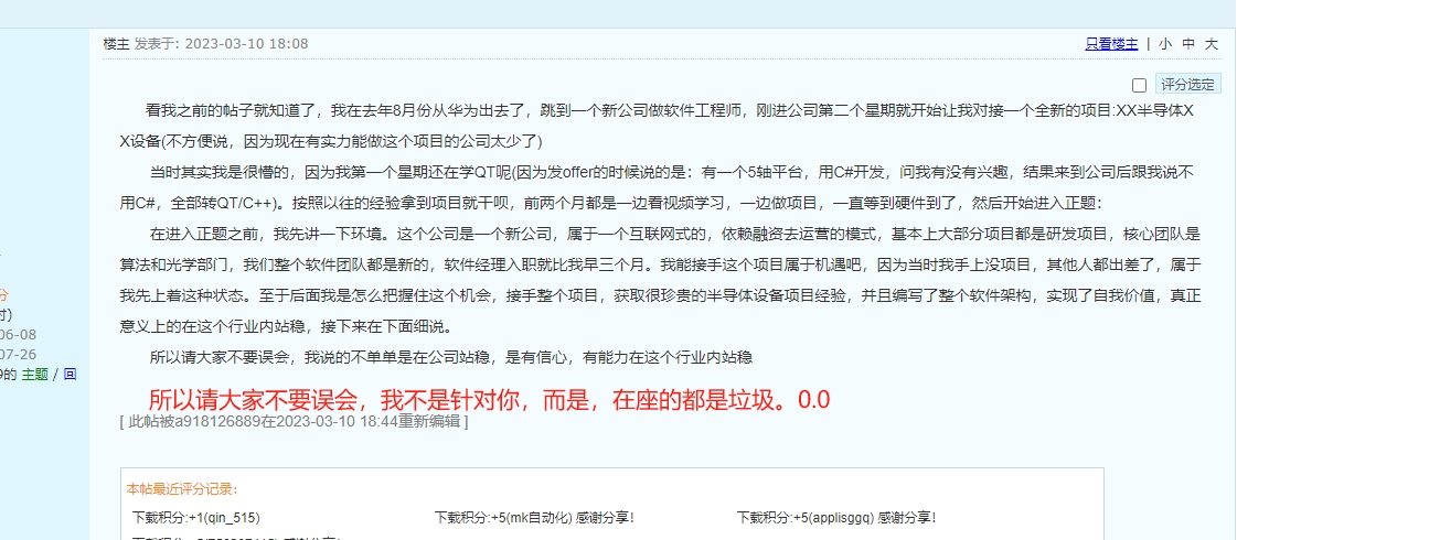 引用引用第2樓a918126889于2023-03-10 18:40發(fā)表的 :------------------2023.03.24----------------------最近出差了,閑下來(lái)繼續(xù)寫(xiě)下去,上接那位高工,大跌眼鏡: 大家做項(xiàng)目都會(huì)遇到這個(gè)情況吧,后加入項(xiàng)目的人肯定是以先接手項(xiàng)目的人為主,然后去展開(kāi)工作的。所以這位高工的工作是我這邊給安排的,我當(dāng)時(shí)在寫(xiě)著UI和軟件架構(gòu),硬件測(cè)試的工作交給了他,其中最關(guān)鍵的是一個(gè)線掃相機(jī)采圖的功能,足足弄了一個(gè)半月,最后交付給我一個(gè)核心代碼只有20行的東西給我,功能測(cè)試的一塌糊涂,基本上完全不能用,最牛逼的是,他還跟部門(mén)老大和項(xiàng)目經(jīng)理說(shuō)測(cè)試完成了! 那天晚上我直接吊人了知道吧,當(dāng)著部門(mén)老大和項(xiàng)目經(jīng)理說(shuō)這個(gè)功能等于沒(méi)開(kāi)發(fā),我不能接受,過(guò)了一個(gè)星期他被勸退了(試用期的最后3天)。從此我這個(gè)項(xiàng)目所有核心功能模塊和測(cè)試工作都是我一個(gè)人完成的,后面講軟件架構(gòu)開(kāi)發(fā)的故事,以及背后的意義。.......