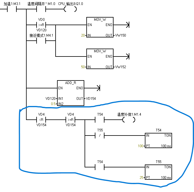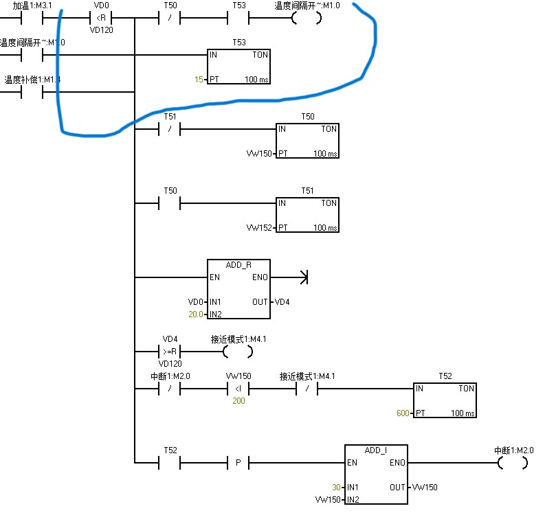 這個程序1中藍色圈的部分是先等T53時間到M1.0才能通是吧。