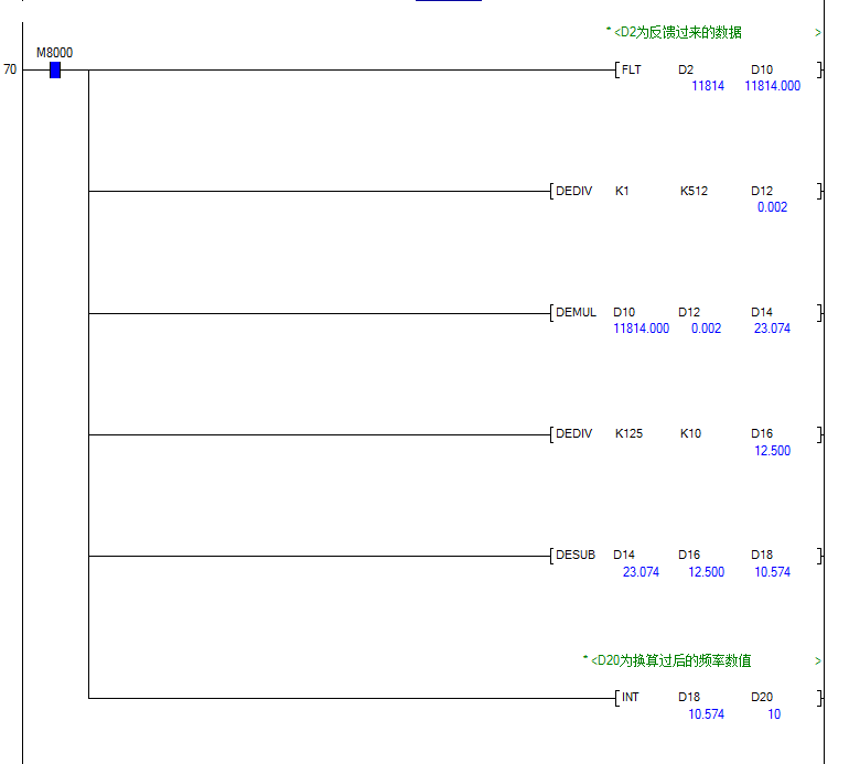 圖1為三菱PLC 的浮點(diǎn)程序,圖2 為我自己換算的數(shù)據(jù),不知道哪里錯了,讀出來的數(shù)據(jù)只有10,而變頻器實(shí)際輸出有25.望高手指教呀