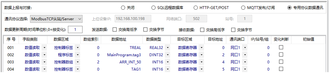 序號004是PLC內(nèi)名稱為‘TAG1’的INT類型的控制器標簽,對應(yīng)到Modbus地址的HR5(400006);