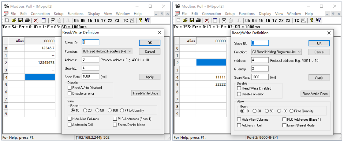 參數(shù)設(shè)置完成后下載重啟后,即可通過上位機主站軟件進行測試,以下是通過Modbus Poll的軟件測試設(shè)置和測試的截圖: