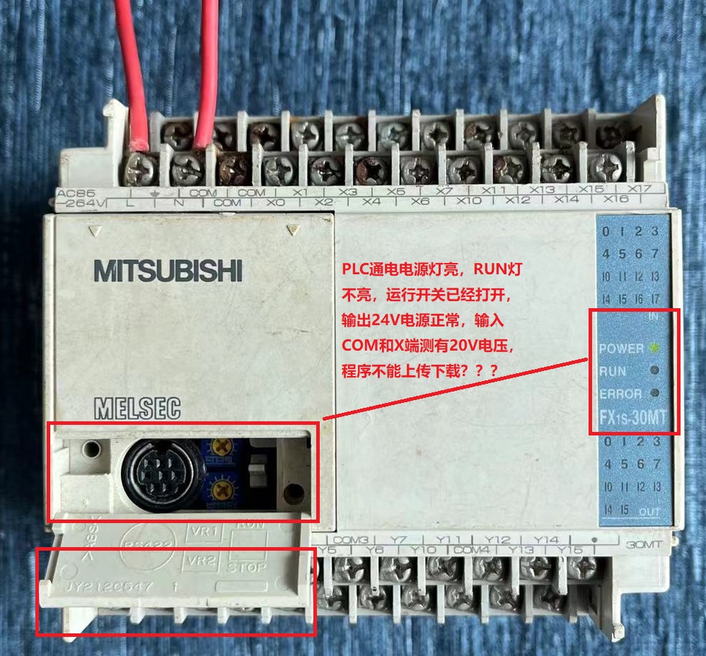 三菱FX1s-30MT-001PLC不能運行,話說這臺PLC是之前練手用的、所有功能都是正常的,歷史有些久遠了而已,現在想要解開封印讓它發光發亮,無奈沒有這個實力讓它動起來了,在此想請教各位老師這是什么問題呢?問題描述:通電電源燈亮、RUN燈不亮,端口不能與電腦通訊,測量輸出24V電源正常,輸入COM與X端短接IO點不亮,測量輸入COM與X端有20V左右電壓。