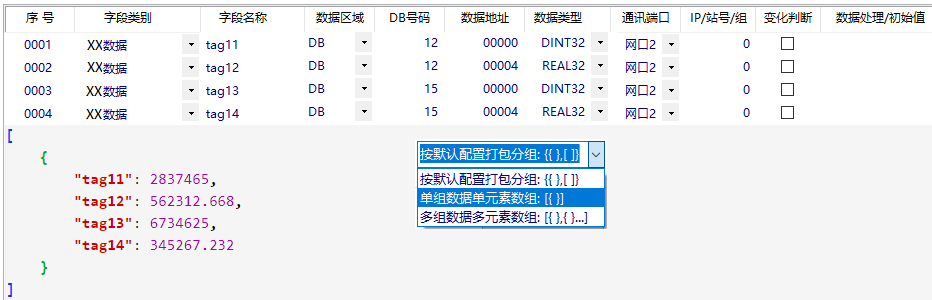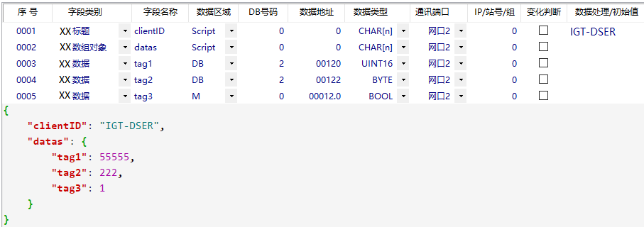 以下是數(shù)據(jù)配置表自動生成的JSON文件的對應(yīng)。JSON文件內(nèi)的數(shù)據(jù)可以自由增減,字符可自由修改,舉例只是為了描述各種JSON文件的結(jié)構(gòu)實現(xiàn)。MQTT協(xié)議的發(fā)布/訂閱也是同樣的對應(yīng)方式。具體如下: