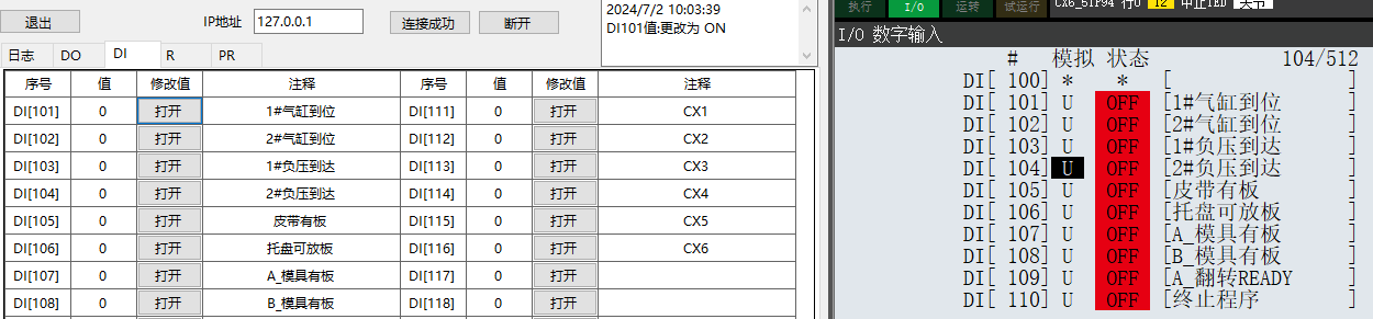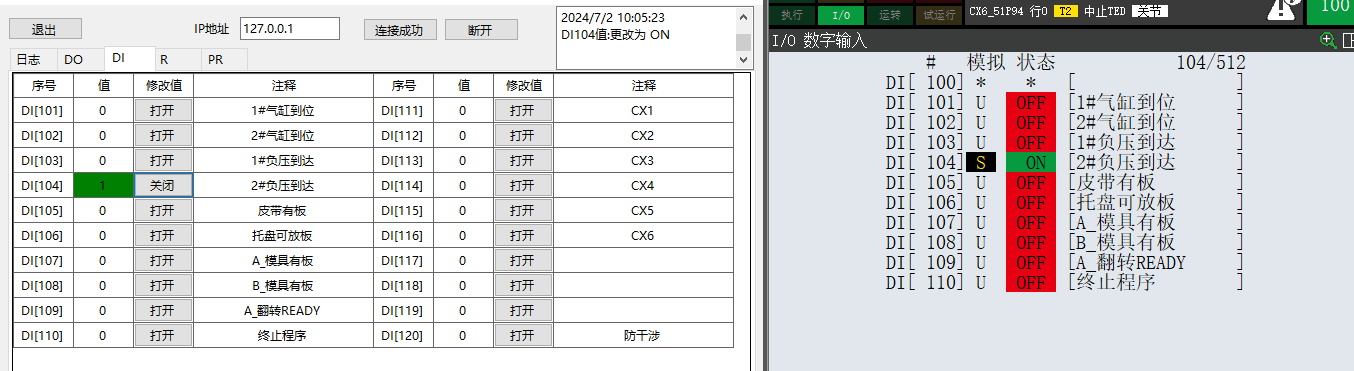 但是寫DI時,必須在示教器上將模擬功能打開才有效。