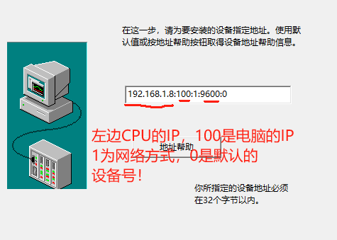 IP地址格式應該是:CPU-IP:PC-IP(末一位):1(網絡方式,固定為1):9600(端口號):0(設備號默認為0)